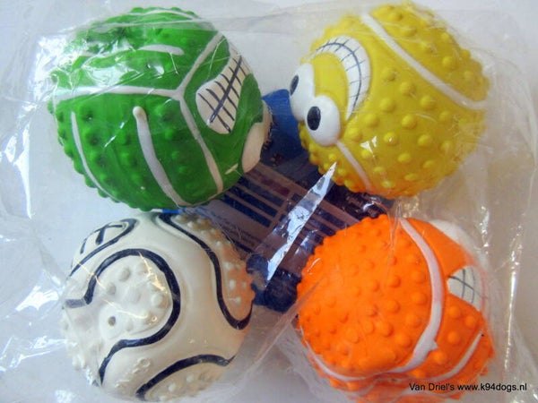 even lekker piepen met deze grappige en sterke latex ballen. ook geschikt voor een pup. per stuk assorti of in een voordeliger 4 pack met verschillende gezichtjes.