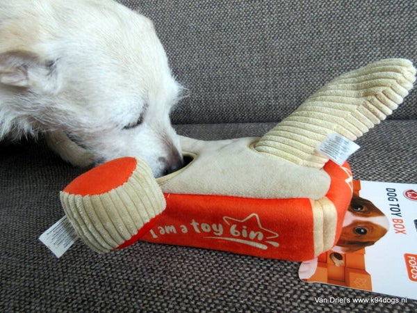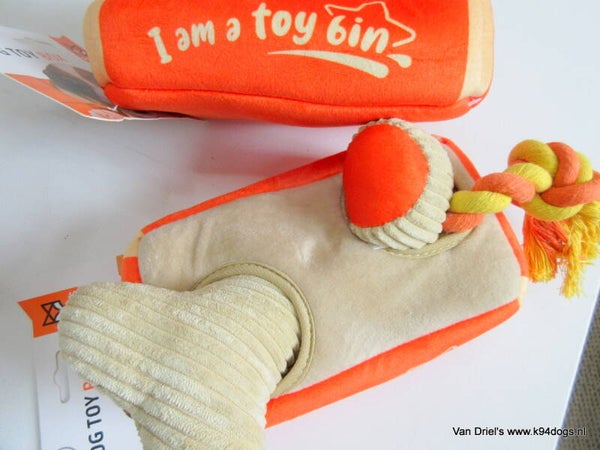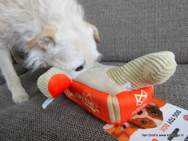 zoek de speeltjes en voertjes in deze pluchebox gevuld met een pluchebot 17cm een piepballetje 7cm en een flosh assorti fleece/touw. de box met daarin twee gaten is geschikt om voer en speeltjes te verstoppen en ontzettend leuk voor zowel een pup als volwassen hond.