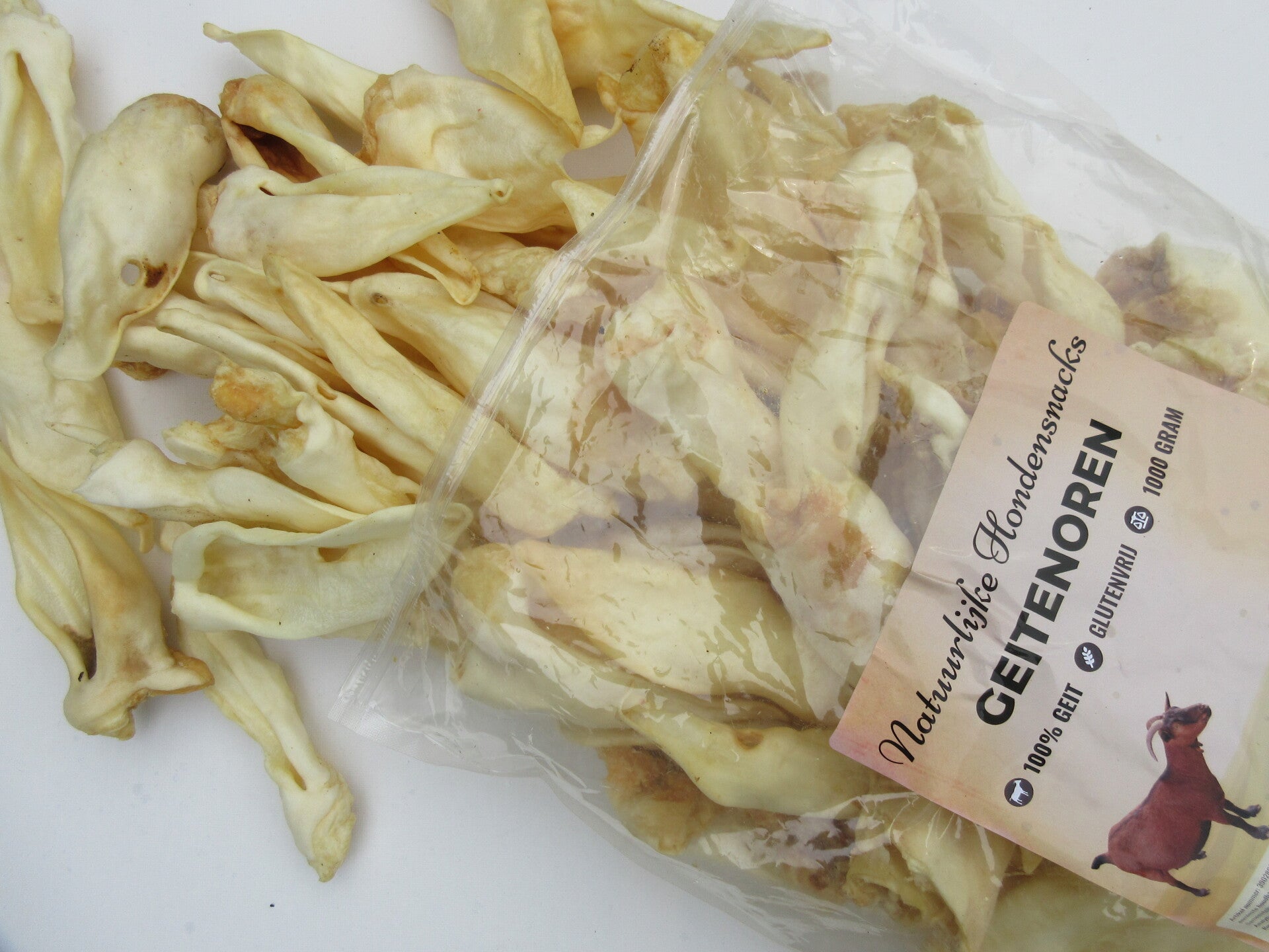 100% geiten oren zonder toevoegingen en glutenvrij. wordt goed verdragen door iedere hond. een heerlijke kauwsnack met een lekkere geur waar geen hond zijn neus voor op haalt. Niet té sterk dus ook prima om gewoon in huis te trakteren. herkomst Turkije