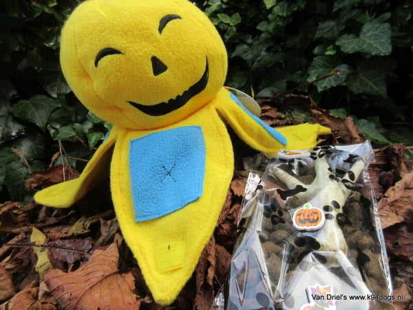 Deze gele pompoen verbergt achter haar bladeren lekkere zoeksnoepjes. ze is gemaakt van zachte fleece en heeft een doorsnee van 18 cm maar opengeklapt is hij van blad tot bladpunt 45 cm. een leuk en origineel zoekspeeltje.
