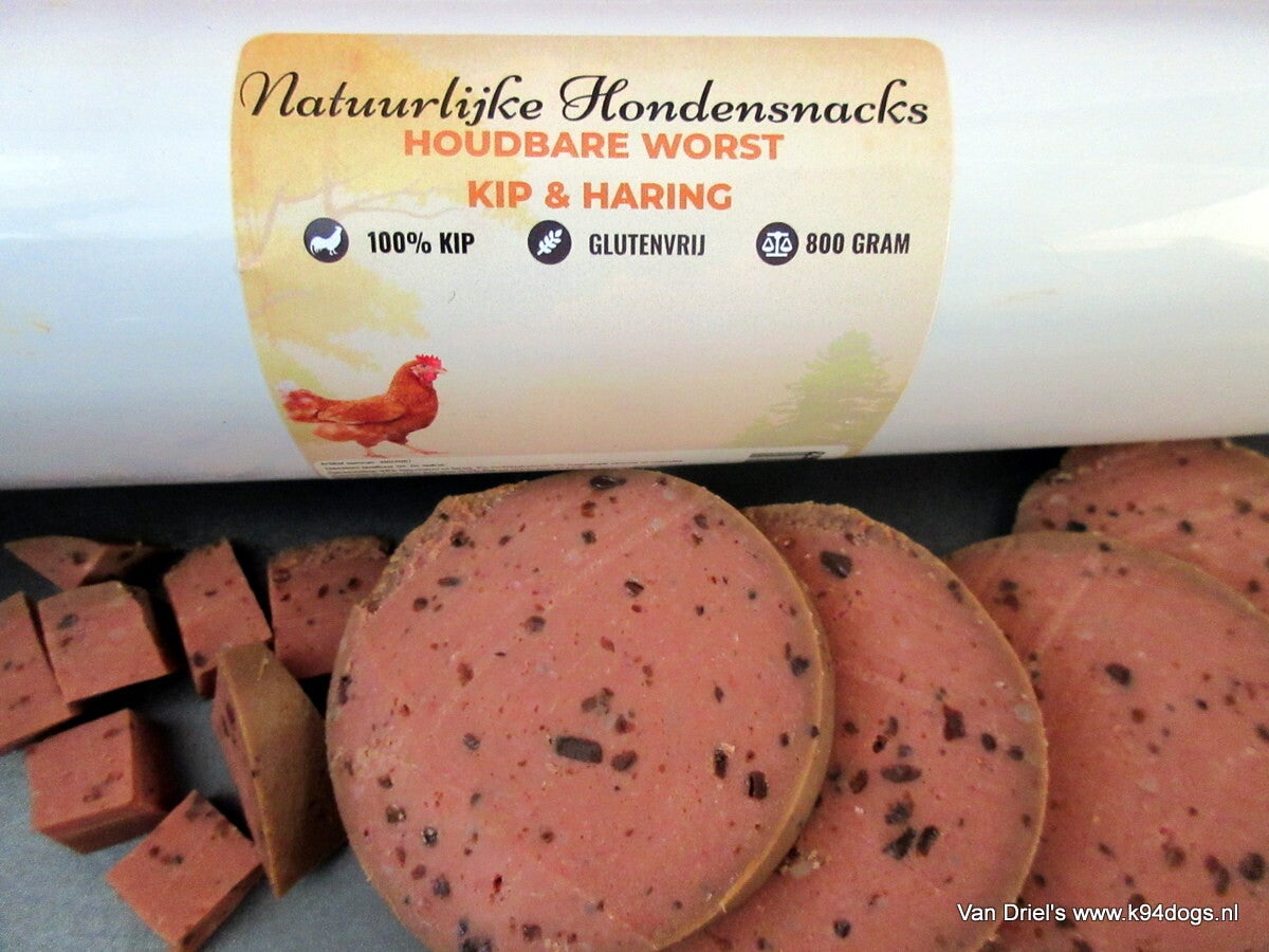 800 gram volledige maaltijdworst met een mooie stevige structuur die je ook in blokjes kunt snijden voor training en beloning. niet vettig dus ideaal voor onderweg en vakantie. verkrijgbaar in 3 varianten - alleen kip - kip/zalm- kip/haring allemaal vrij van gluten