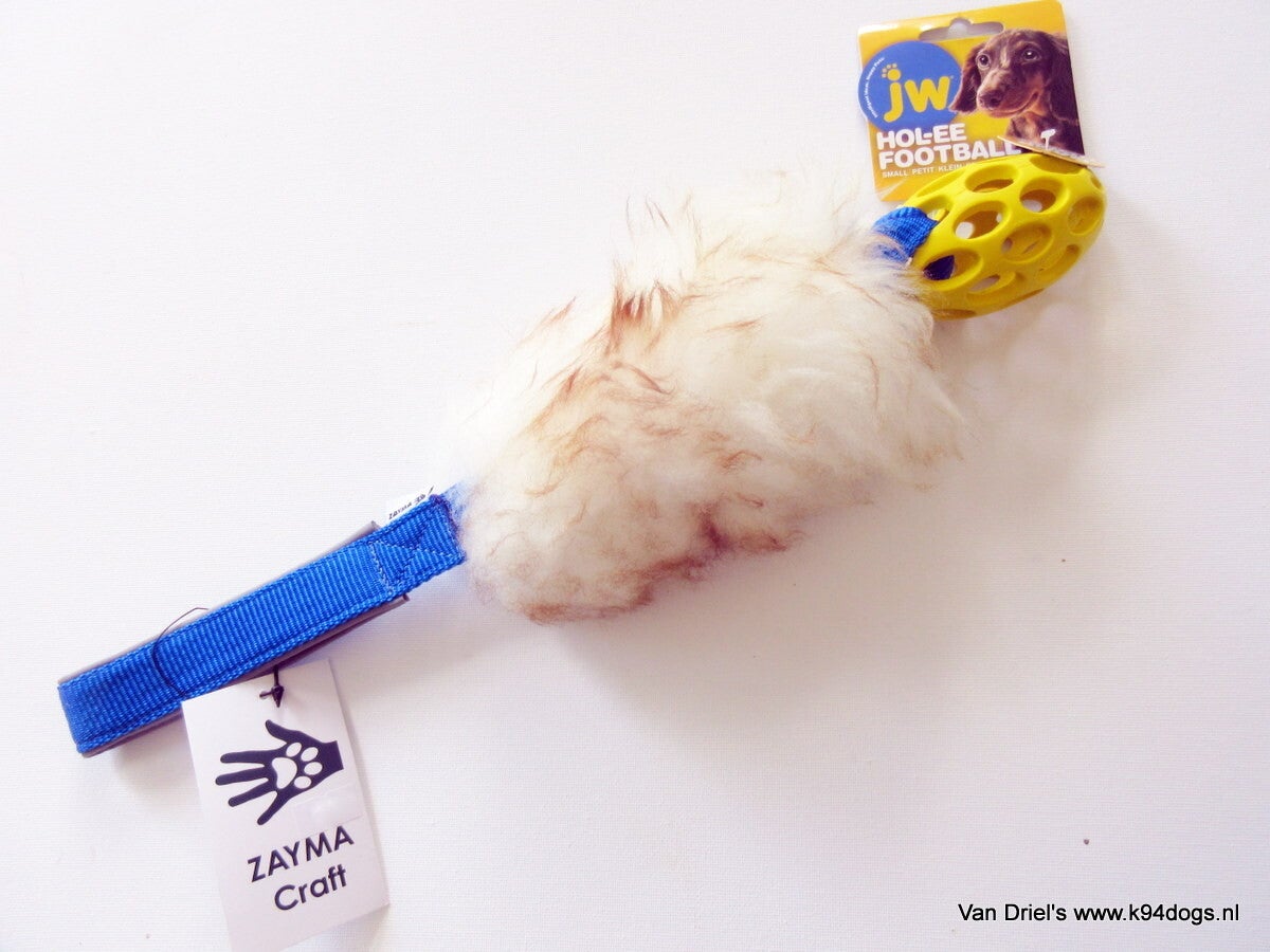 prachtige dikke schapenvacht aan een handgreep in de maten M en L voorzien van een JW hol-e-roller football. Geweldig handmade ZAYMA trainings speeltje. ter motivatie en beloning. assorti gele of limegreen football