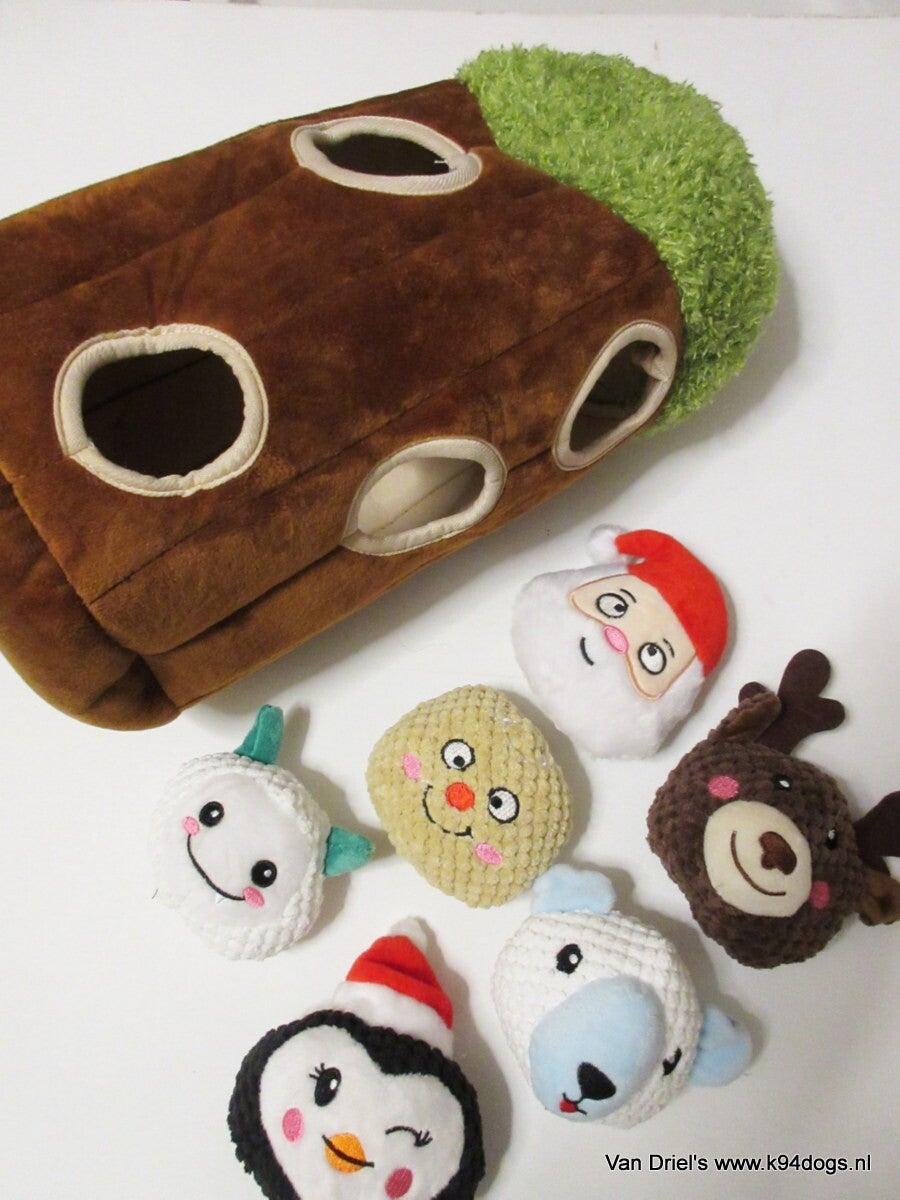 verstop alle 6 de kerst figuren met piep maat ca.13x11cm in de 40cm hoge holle boom met 5 gaten. Wat een geweldig spel om al die leuke pluche ballen te vinden! Inhoud kerstman, eland, peperkoek, poolbeer, pinquin en lammetje met piep.