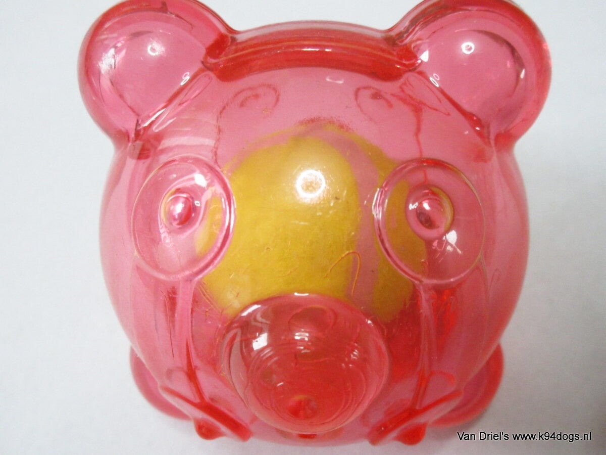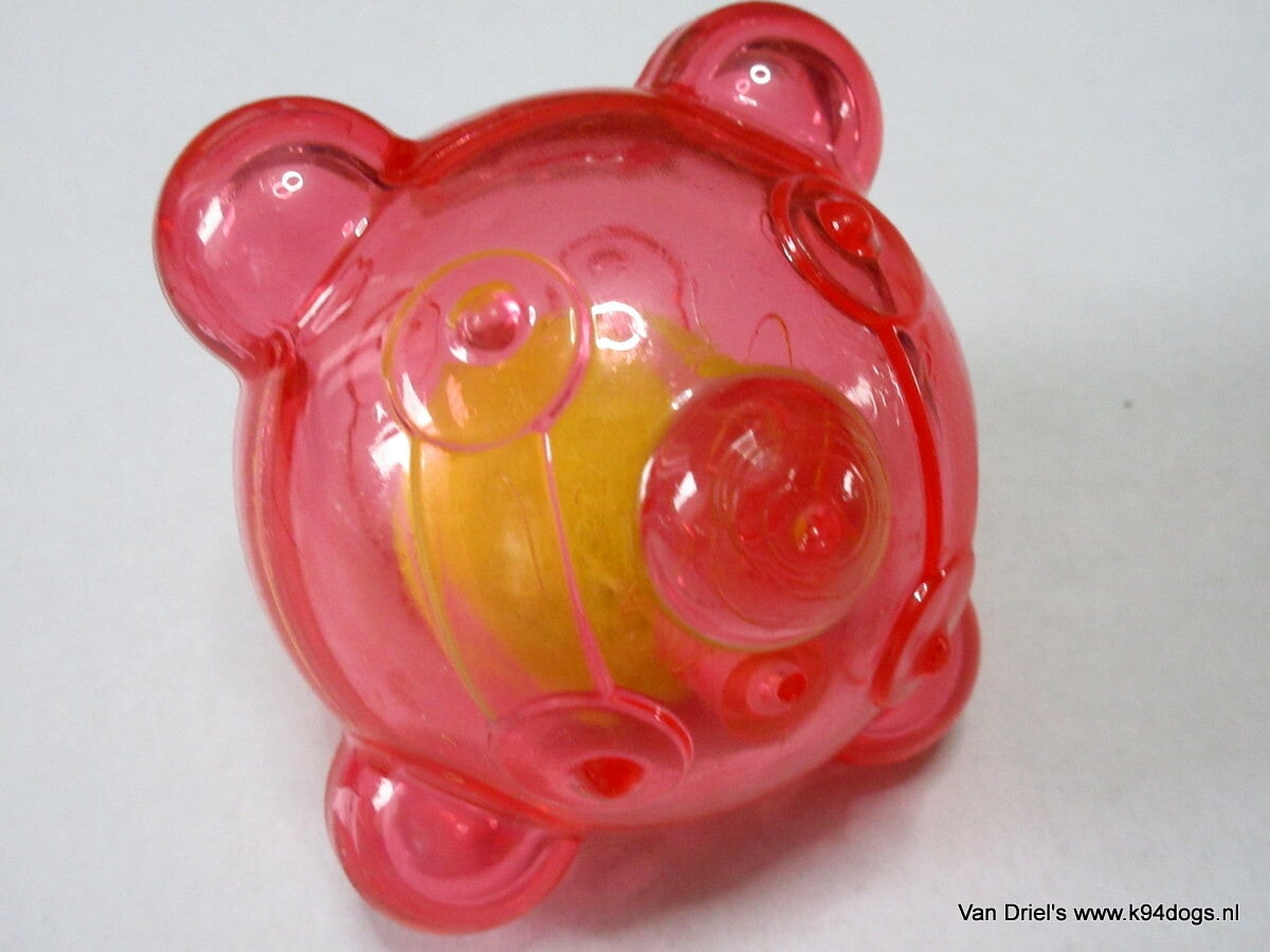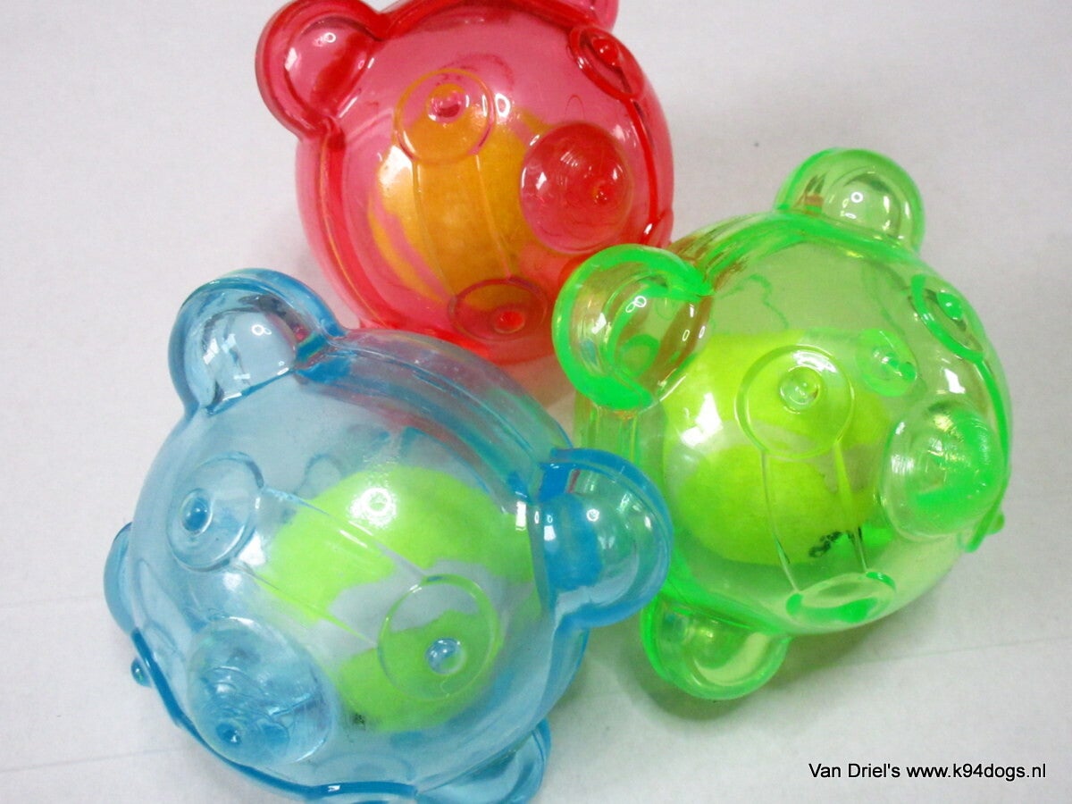 sterke drijvende TPR bal met daarin een kleine piepende tennisbal om het apporteerspel extra uitdagend te maken. de bal heet het uiterlijk van een beer en is er in 3 kleuren. doorsnee 10 cm. ( tennisbalformaat ) merk: Clever dog