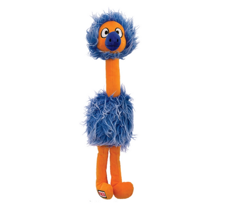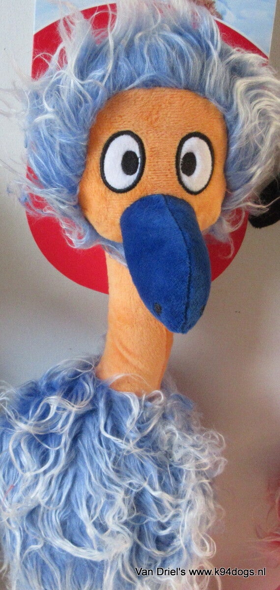 Kong Jumbo birds een vogel met pieper in het hoofd en in de buik, een lang lijf met slungelige benen met een lengte van 53cm. keuze uit blauw, roze of grijze vogel met alle drie heen dwaas gezicht. welke zou jouw hond het leukst vinden?
