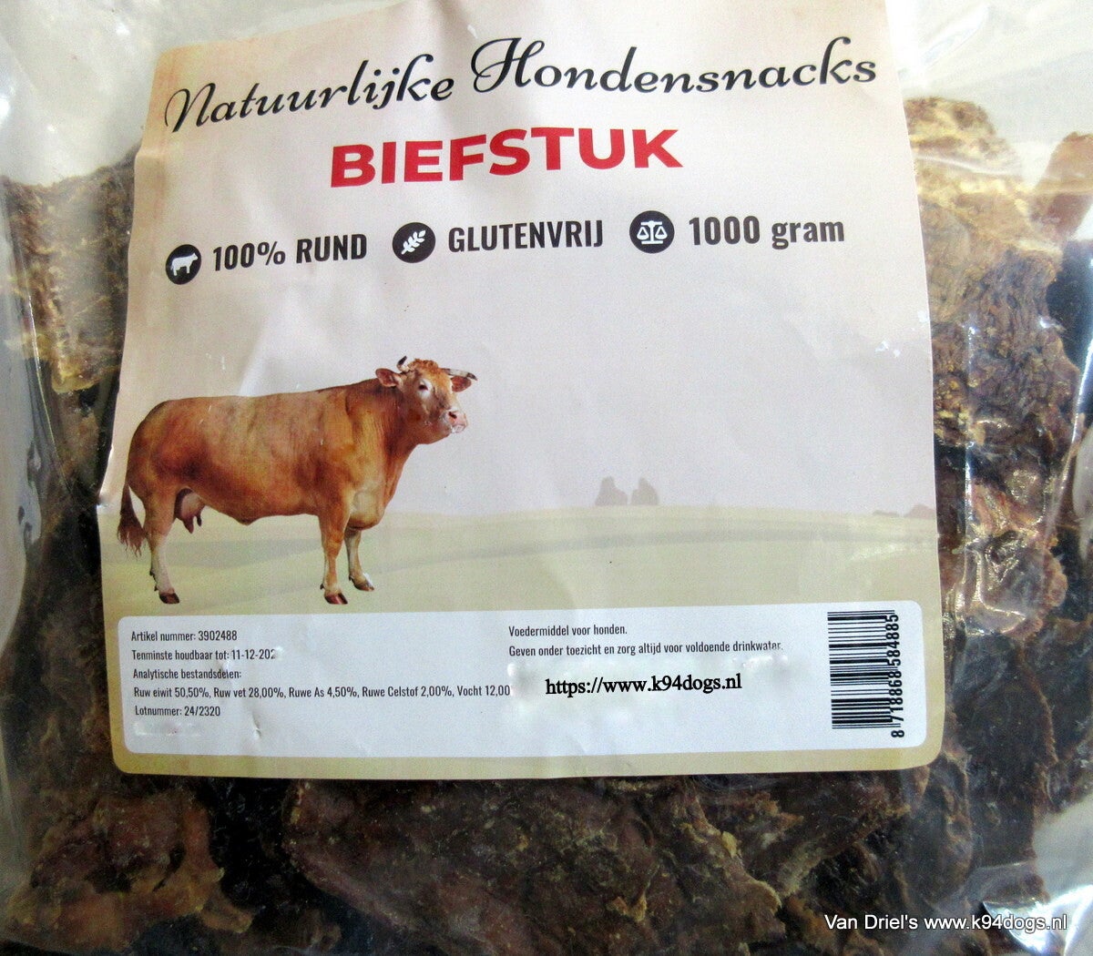 Biefstuk, het beste van het rund, mooie magere stukken gedroogd rundvlees met een heerlijke geur. Dat is 100% vlees zonder toevoegingen in pondzak of een gulle kilozak. bewaar het in een afgesloten bak, zo is het lang houdbaar en blijft de geur behouden. een heerlijke traktatie met bite voor jouw hond.