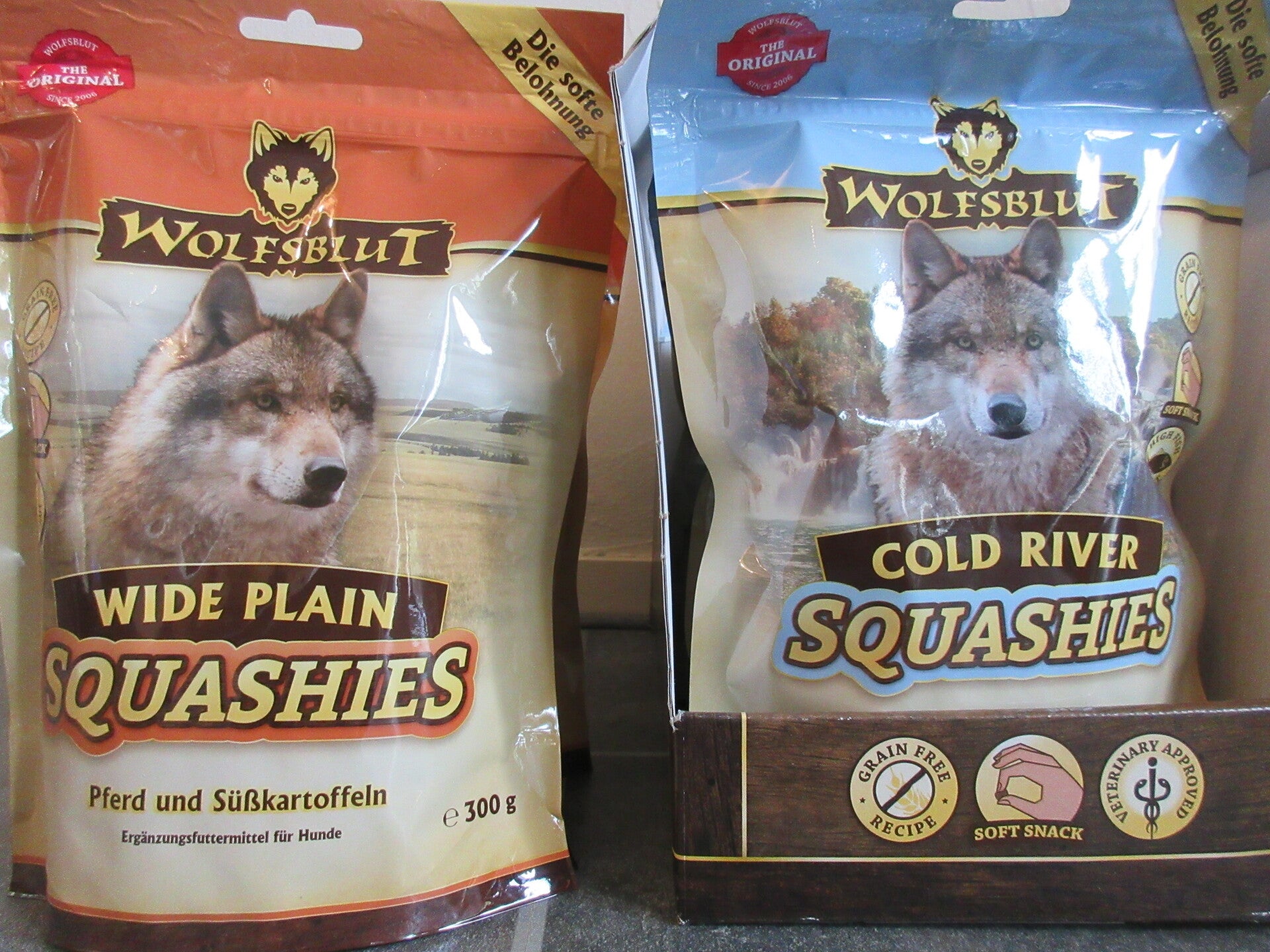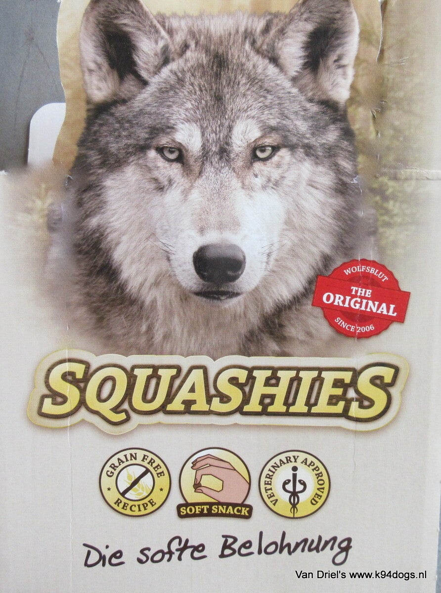 Wolfsblut premium beloningsnacks keuze uit cold river squashies Forel of wide plain squashies paard met zoete aardappel in een 300 grams zak. een snack van hoge kwaliteit, vol vis of paardenvlees en kruiden. vrij van granen zonder toevoegingen of kleurstoffen.