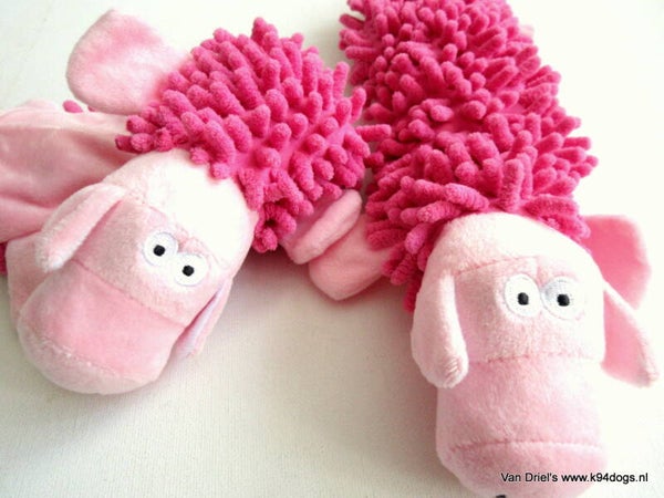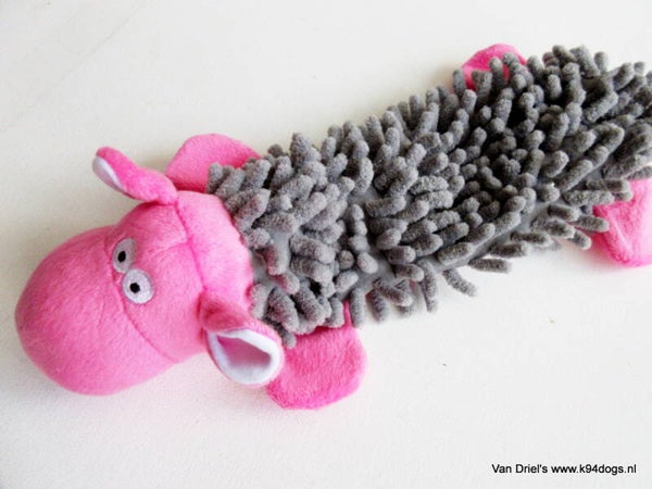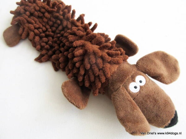 zachte speeltjes van mop met een piep en crackle geluid. keuze uit diverse dierfiguren van 30 cm lang.