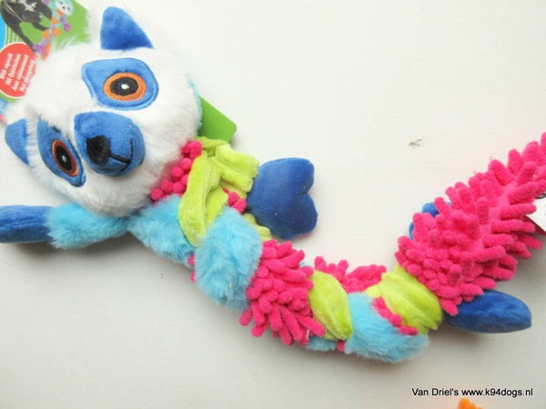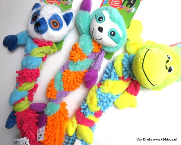 vrolijk gekleurde pluche hondenknuffel met een vlecht 45x12x9cm keuze uit gele aap, lichtblauwe luiaard en wit/blauwe beer met gekleurde staart extra voordelig in set van drie