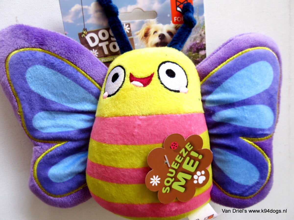 Fleurige crackle pluche vlinder met krakende vleugels en een pieper in zijn pluchebuik een heel leuk pupcadeau met een mooi formaat van 24x16cm en met interessante geluidjes.