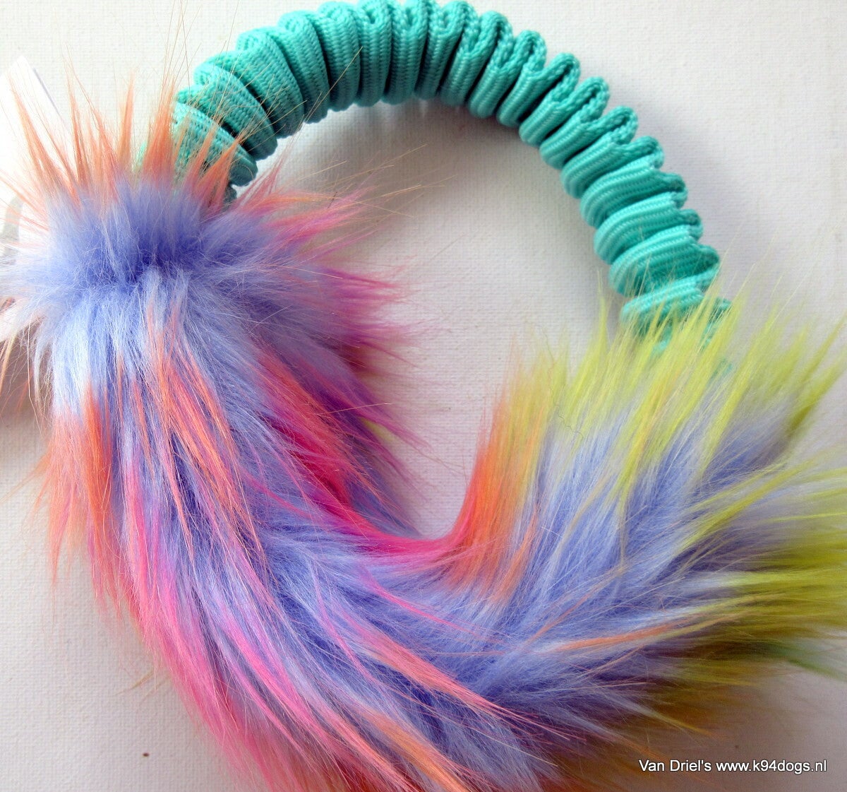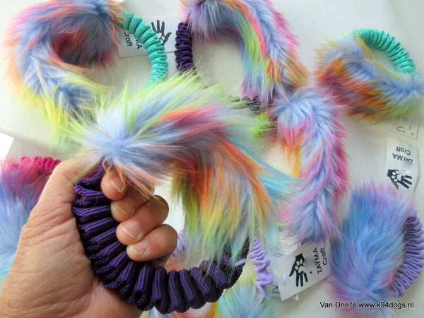 zakformaat bungeering voor training, samen spelen, trekken en apporteren. verkrijgbaar in 2 maten die makkelijk in je zak passen. Fur in regenboogkleuren aan een stevige zayma bungeering met veel grip maat XS doorsnee 12cm met furgedeelte 14x5cm of maat S/M doorsnee 16cm met furgedeelte 21x7cm