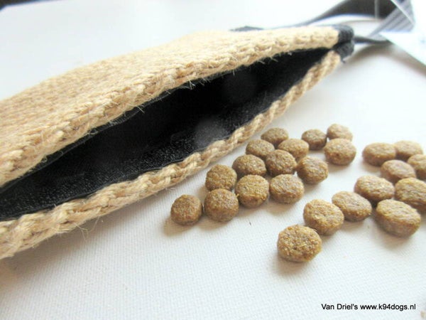 Platte voerdummy van stevige jute aan een handgreep voor training en beloning. mooi gevoerd zodat hij makkelijk is te reinigen en met een formaat van 21x9 + een greep van 16cm lang heeft het een handzaam formaat. De trainingsdummy is goed doorgestikt en sterk. het voervak sluit met klittenband