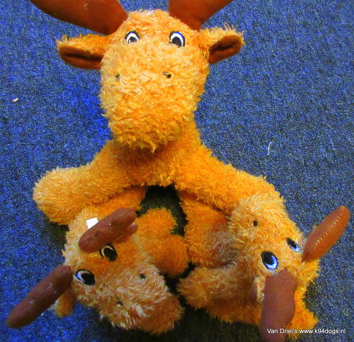 een setje van moeder eland en 2 pluchekalfjes leuke speeltjes met een pieper. moeder is 30x14 en 2 kalfjes van 10x14