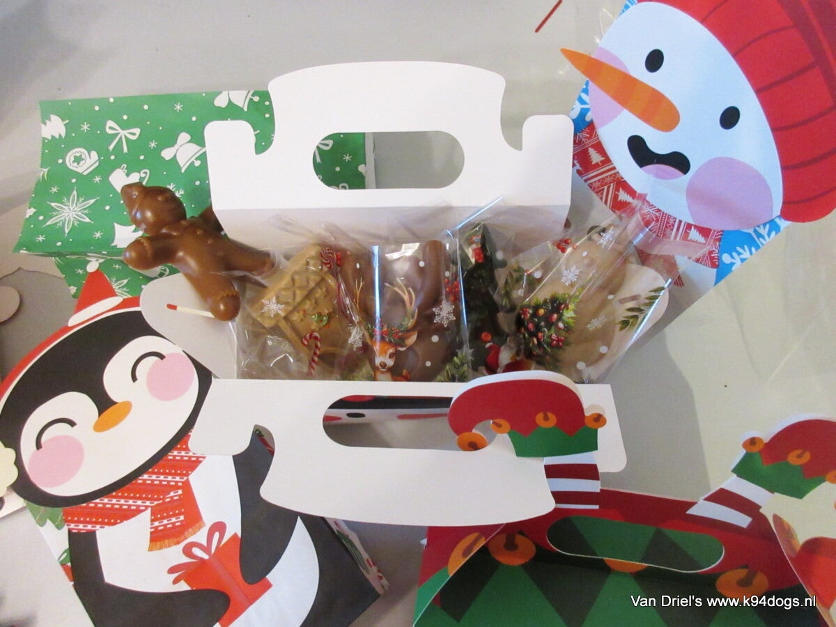 Leuke kartonnen kerstkoffer van 21x20x9 gevuld met 6 leuke cerea kerstsnacks. 3 met kip en 3 vegetarisch een ontzettend leuk kerstcadeau onder de boom of om jouw beste wandelvriendin mee te verrassen. we hebben koffertjes met de kerstman, een elf, sneeuwpop eland en meer. allemaal even leuk!! ook heel geschikt als relatie geschenk dus korting bij aankoop van 10 stuks