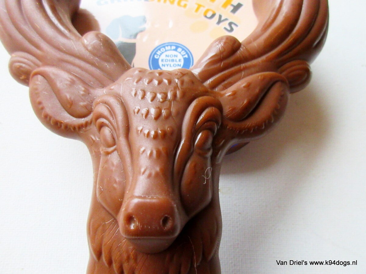 Stoer en sterk hert met gewei 17x14cm gemaakt van nylon. Dit speelgoed kan tegen een stootje, jouw hond kan er op kauwen en het smaakt naar beef, dat maakt het heel interessant. Dit Non-toxic speelgoed is geschikt voor slopers maar het is niet om op te eten dus als er na verloop van tijd stukken af gaan is het tijd om te vervangen. je kunt het makkelijk reinigen onder de kraan en het is erg goed voor de tanden. geschikt voor honden met een volwassen gebit. Niet voor pups met een melkgebit.