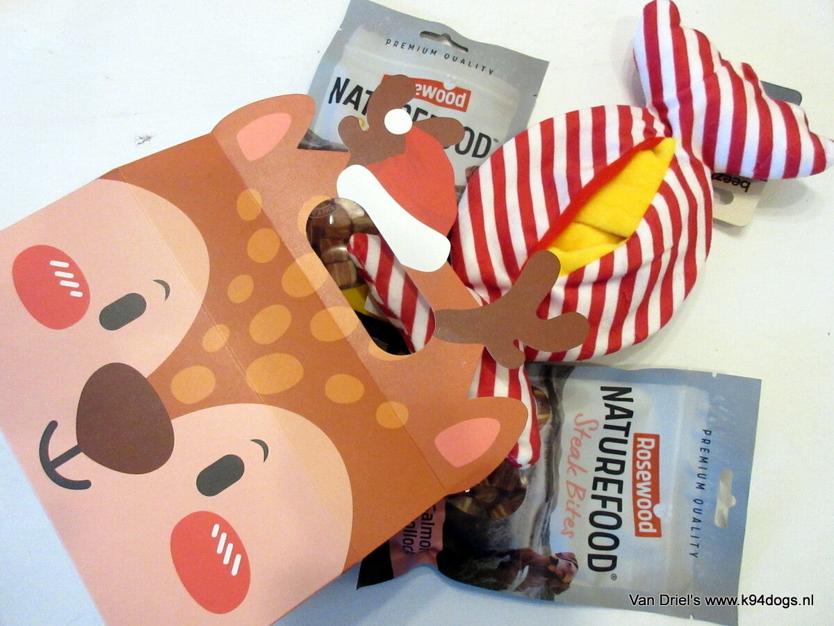 Een cadeaudoos met hide&seek snuffelspel kerst toffee 26x15cm plus 2 zakjes naturefood zachte beloning blokjes in een mooi cadeaukoffertje dat is een té gek cadeau om mee te brengen met de kerst. de pluche toffee heeft vakjes waarin je de lekkere naturefood blokjes kunt verstoppen en om het moeilijker te maken rol je de linten op en plaats je ze terug in de toffee. Welke hond maak jij hier met de kerstdagen blij mee? MAAT: 26x15 + linten met vakjes van 25cm lang