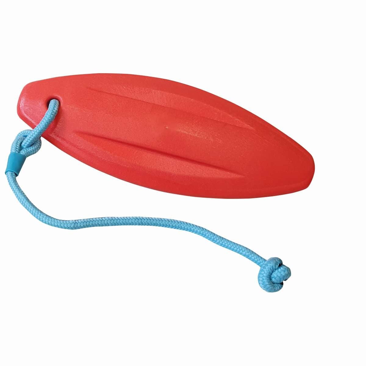 Sterk drijvend apporteerspeeltje van duurzaam en flexibel TPR. Door de goede vorm kan de hond het gemakkelijk vastpakken. formaat 26 x 10 cm en ca 3 cm dik met een werpkoord.