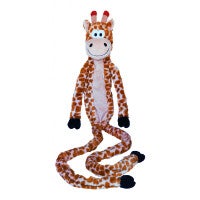meer dan een meter speelplezier ! met een krakende buik en lange slungel armen en benen met een touw erin is deze giraffe met pluchehoofd waarin een piepje zit het aller aller leukste speeltje voor jouw hond of het gaafste puppy sleur en slinger ontdekkings speeltje