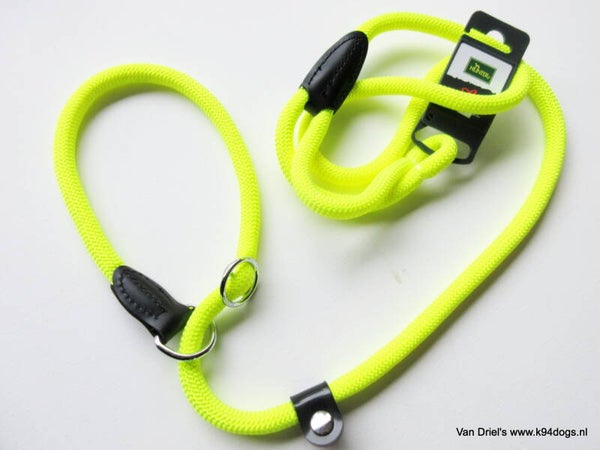 In omvang verstelbare hunter jachtlijn voorzien van een stop die geheel dichtslippen voorkomt. Deze versie heeft een felle roze of gele fluorkleur. sterke maar zachte vanglijn met genaaide lederen versterking bij de handgreep en de hals. lengte 1.70 cm hier valt de nekomvang van af. de riem is en ruim 1 cm dik en is geschikt voor middelgrote en grote hondenrassen.